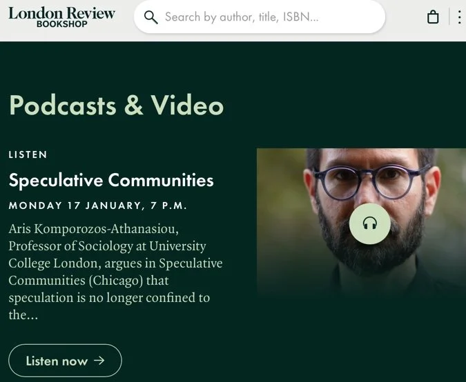 Hosted by the London Review of Books Bookshop, I was in conversation with some of my favourite thinkers: artist and writer James Bridle, journalist and commentator Grace Blakeley, sociologist and LRB contributor Will Davies. For the UK launch of my book Speculative Communities, we discussed the cult of crypto-trading, the meanings of solidarity in the face of conspiracy illusions, and possibilities for counter-speculative politics.